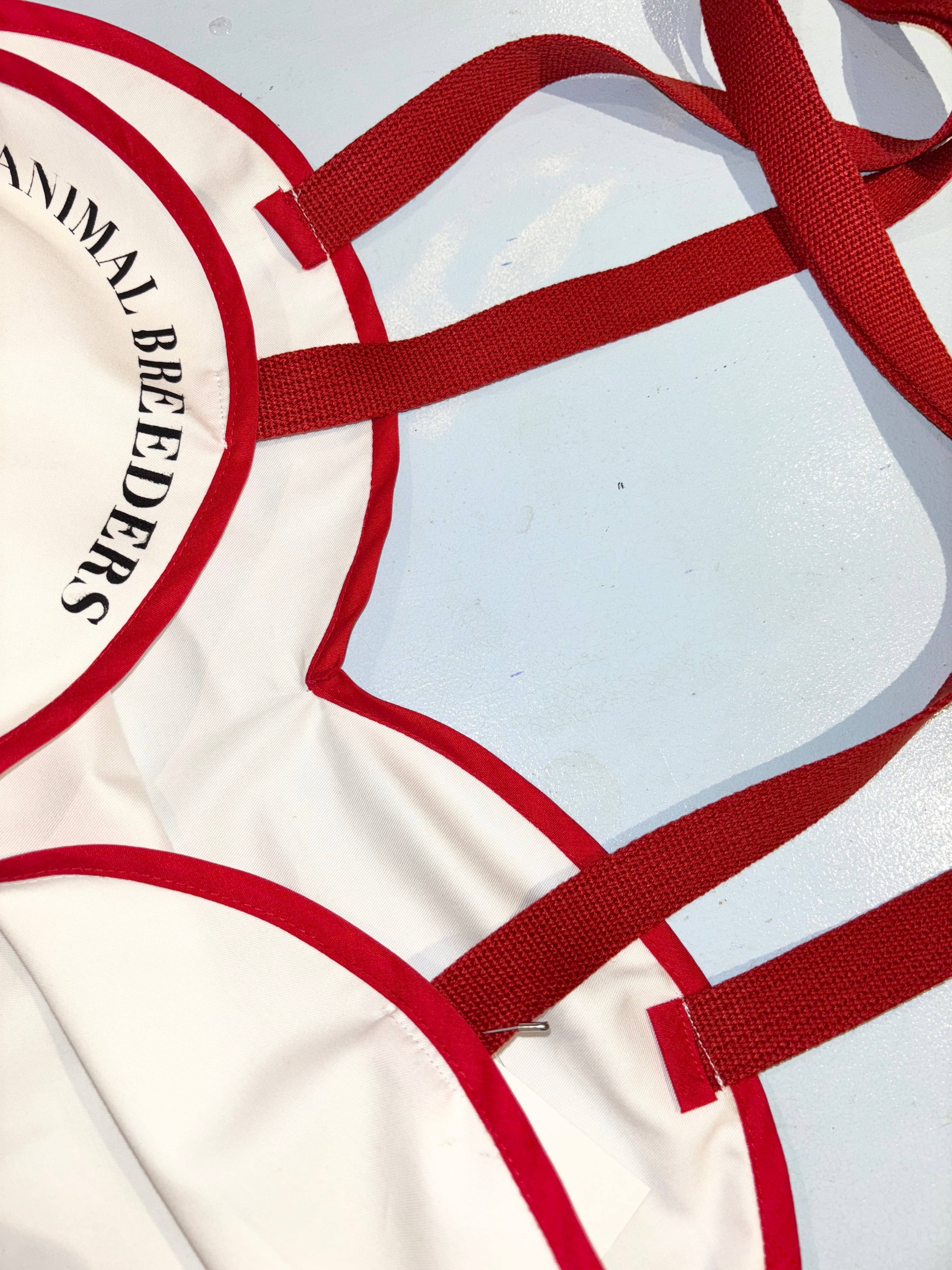 真っ白の薄手コットンブロードに赤いヘム。長めのハンドル。ギフトにも最適なアイテム。