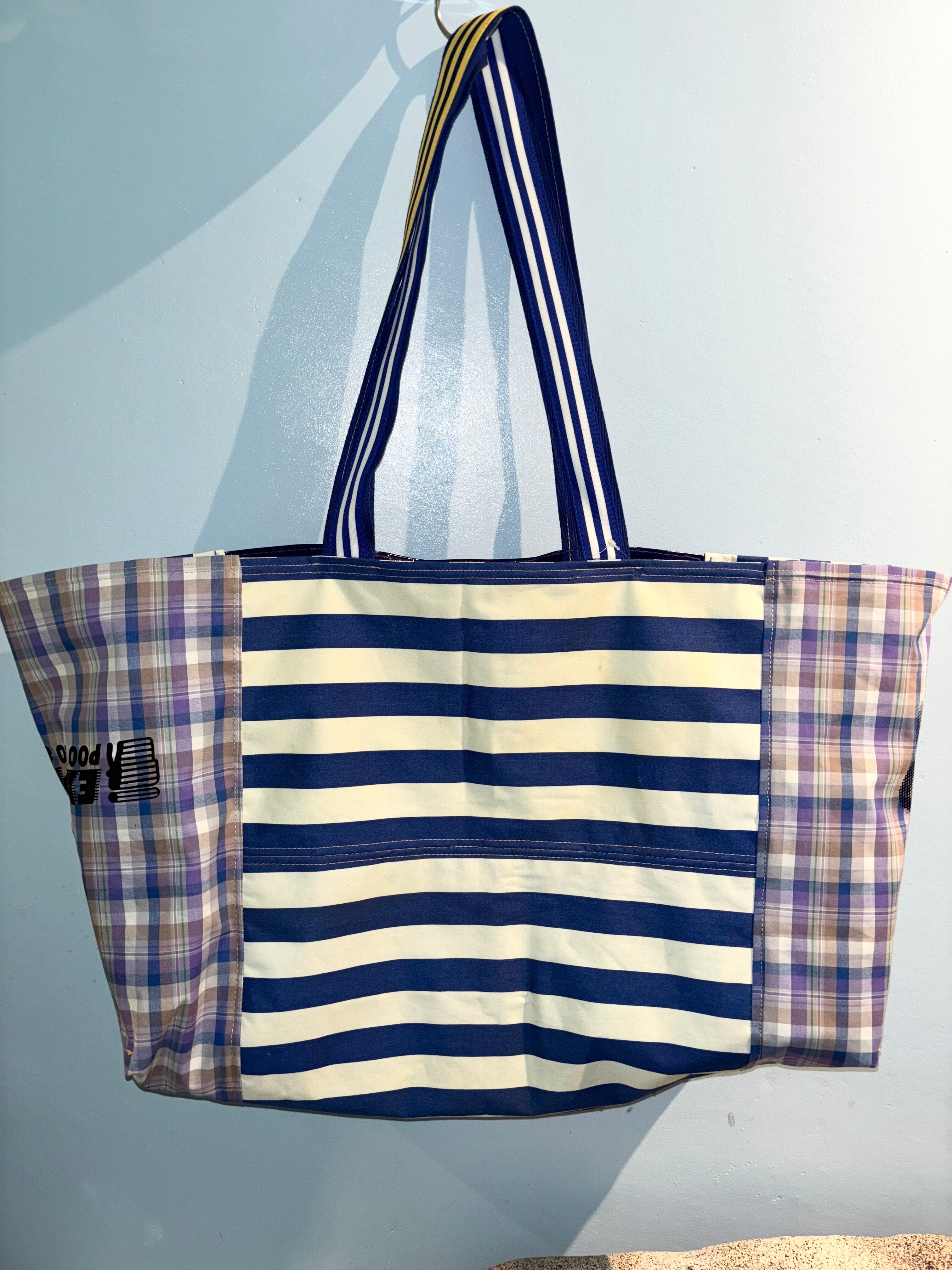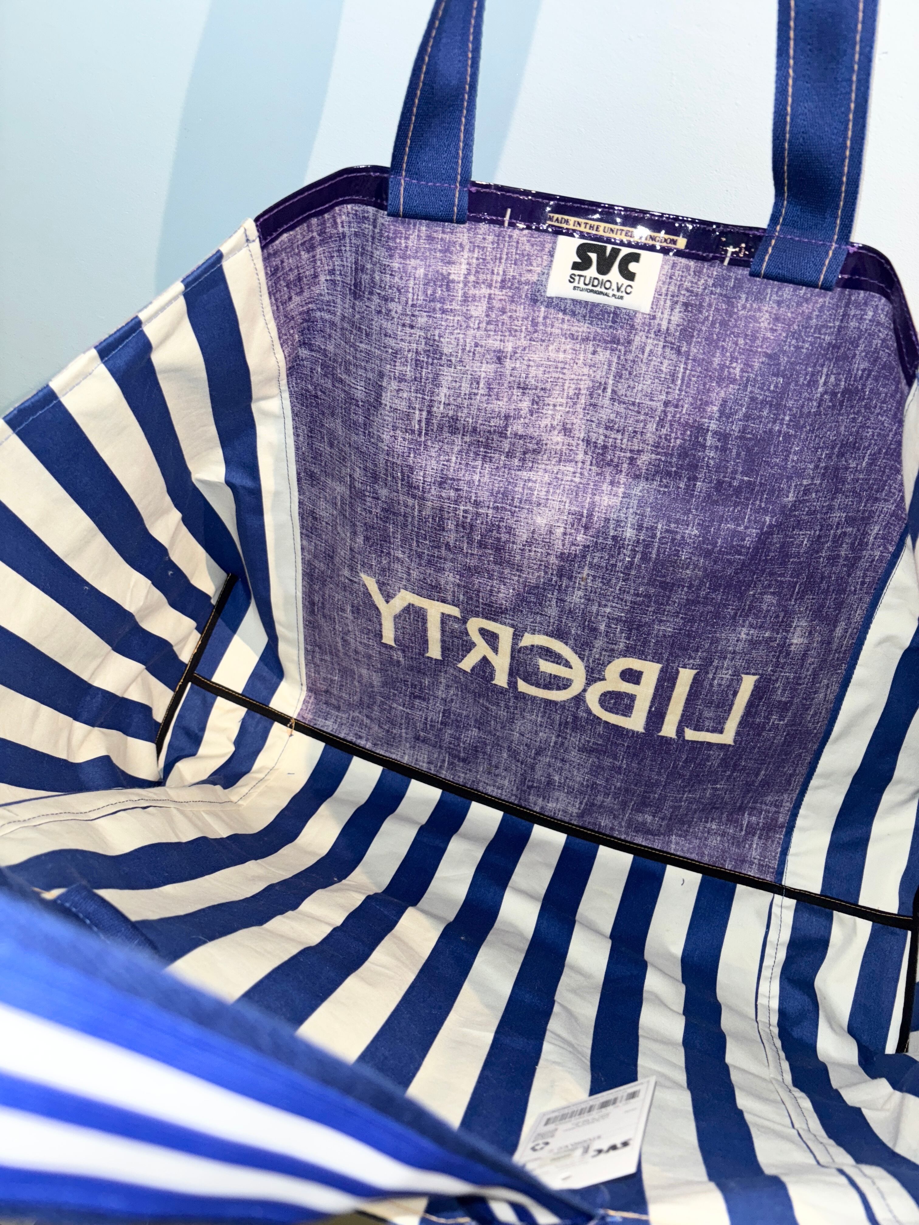 英国のテキスタイルブランド“LIBERTY”のショッピングバッグを解体して、カラフルなユーズド素材を組み合わせたリメイクバッグ。撥水加工されたタフな素材。けっこうガチガチです。大きさを例えるなら、IKEAバッグのLサイズぐらい。