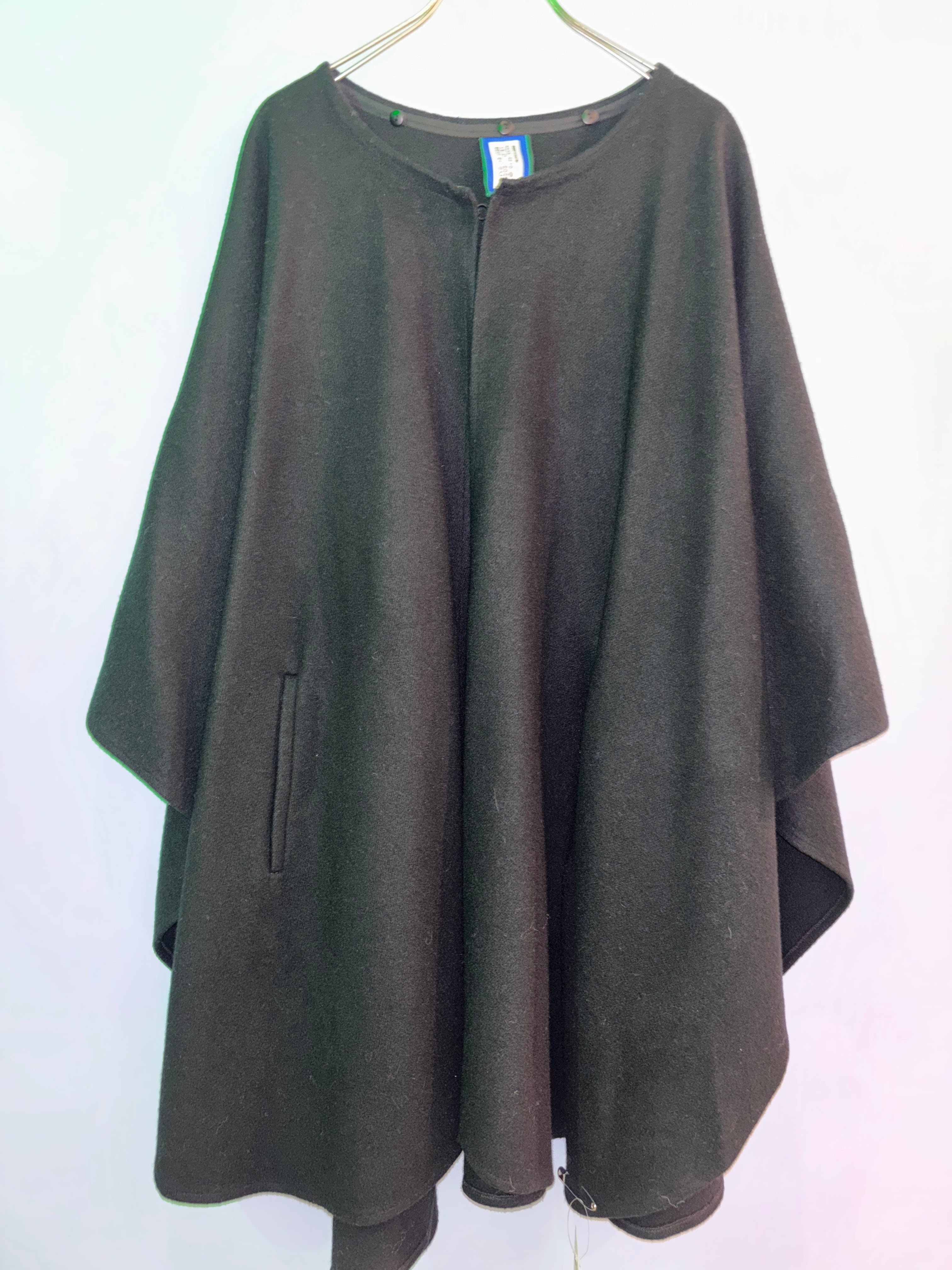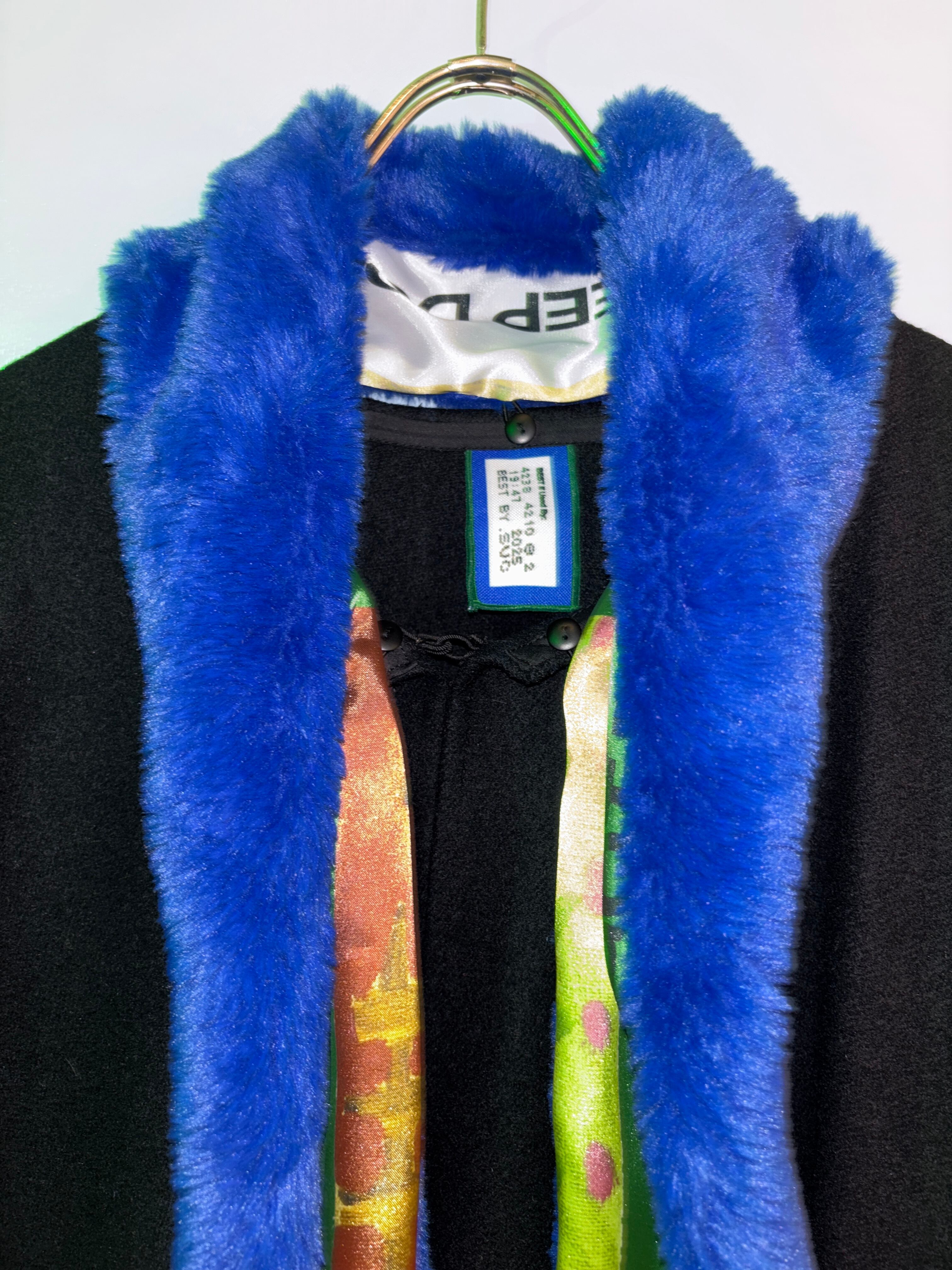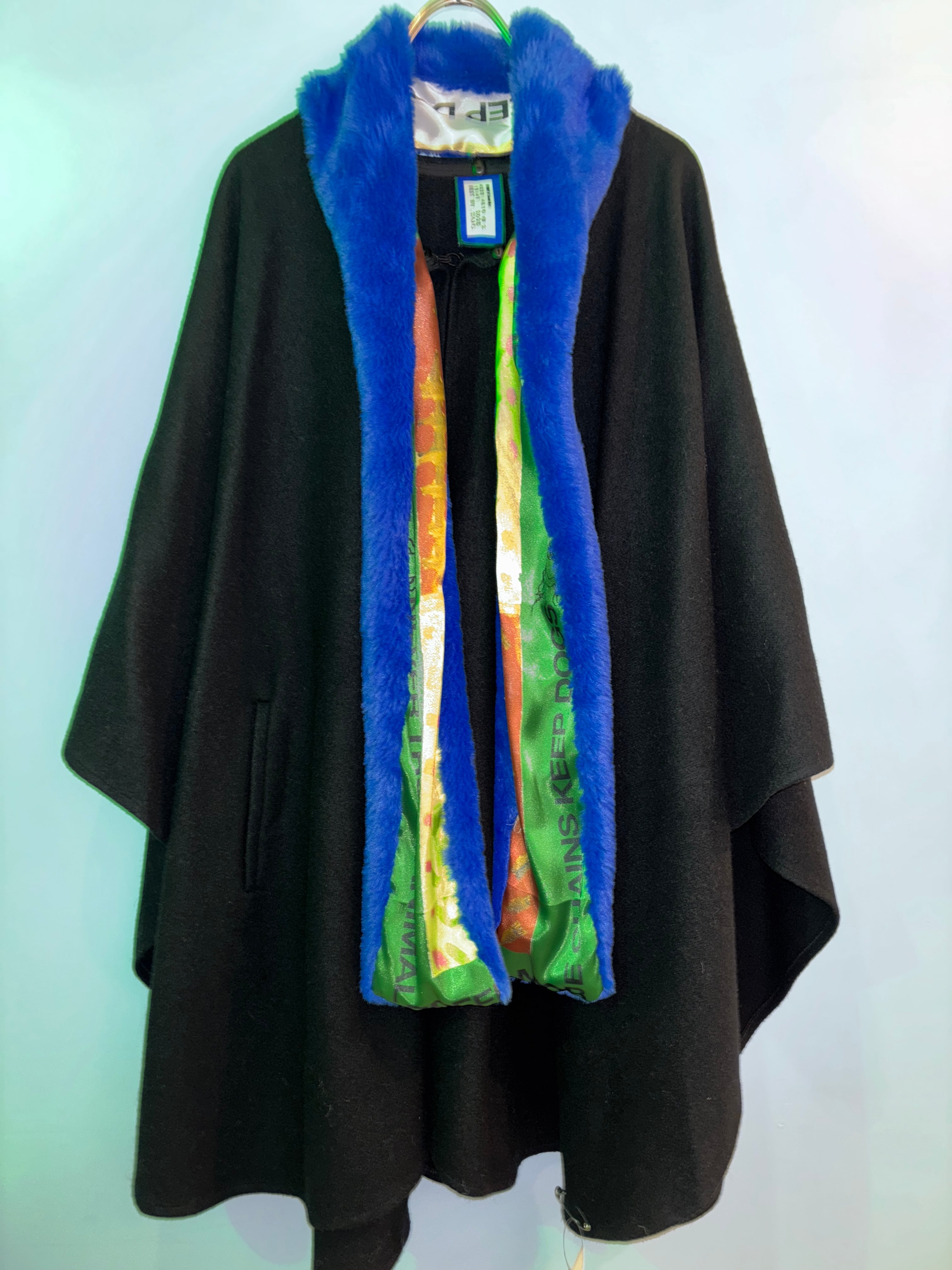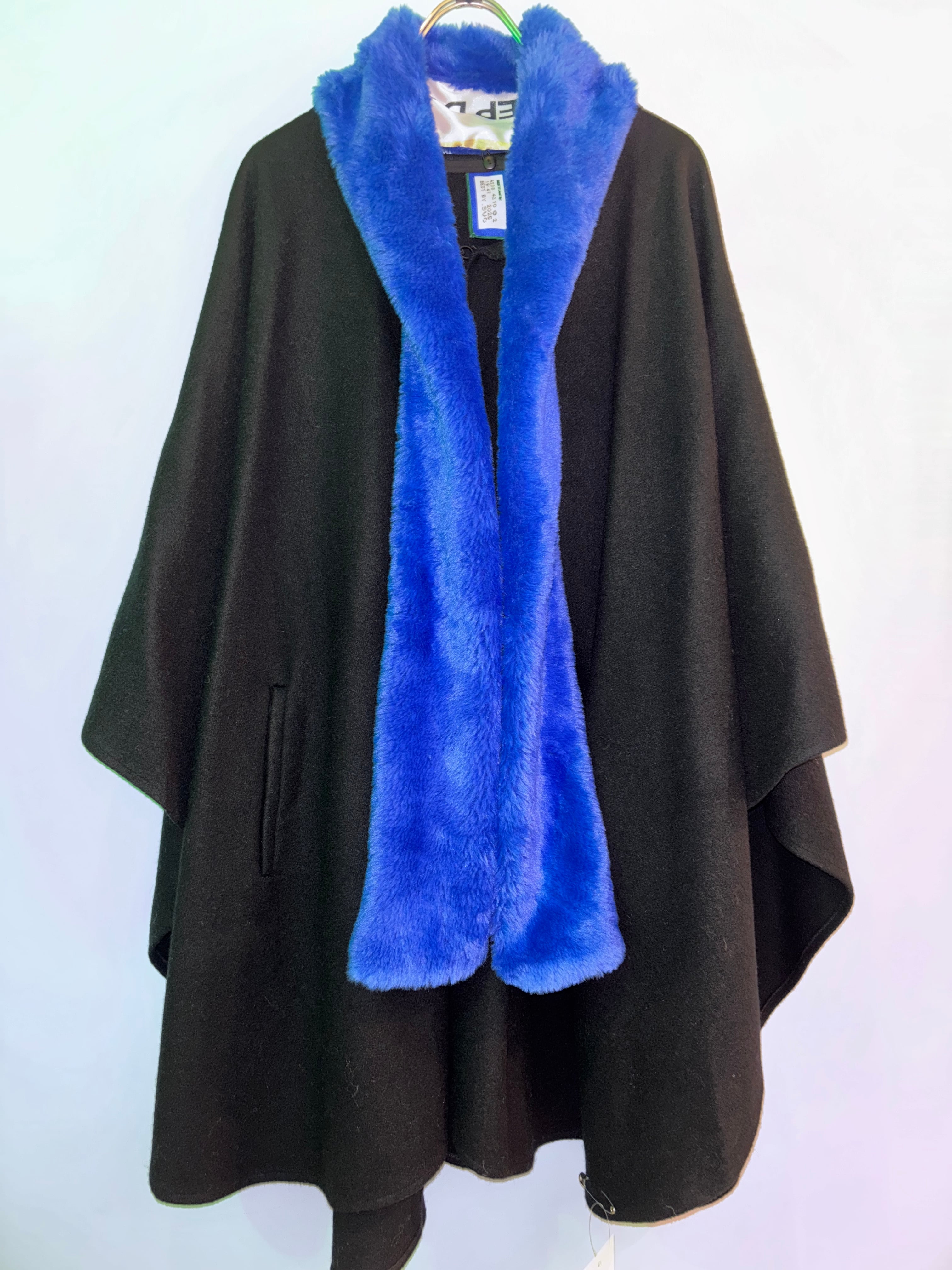 古着のシックな黒のケープにロイヤルブルーのフェイクファーのショールを付けたリメイク商品です。