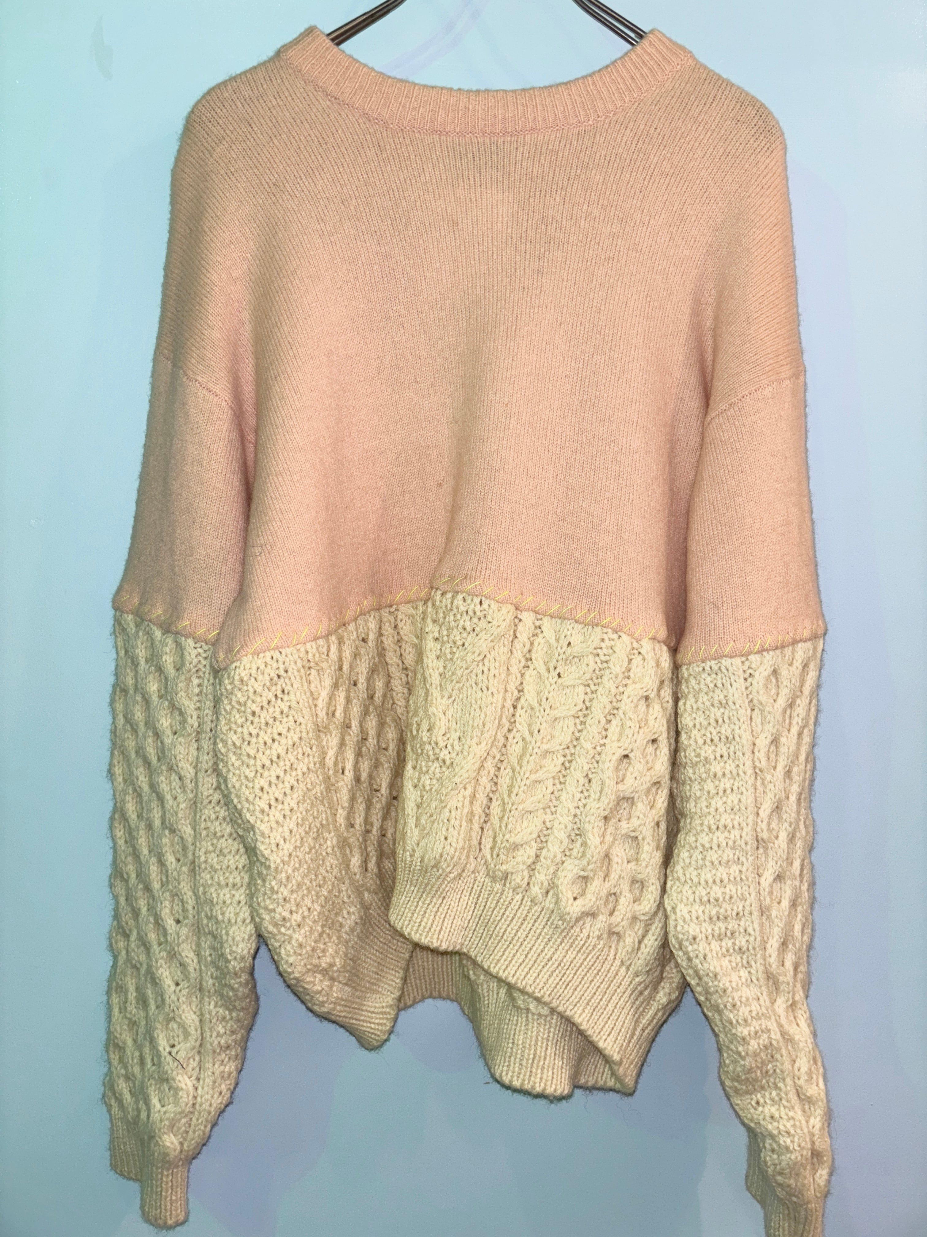 イギリス製ビンテージフィッシャーマンズニットとベビーピンクのセーターをドッキングさせたリメイクアイテム。