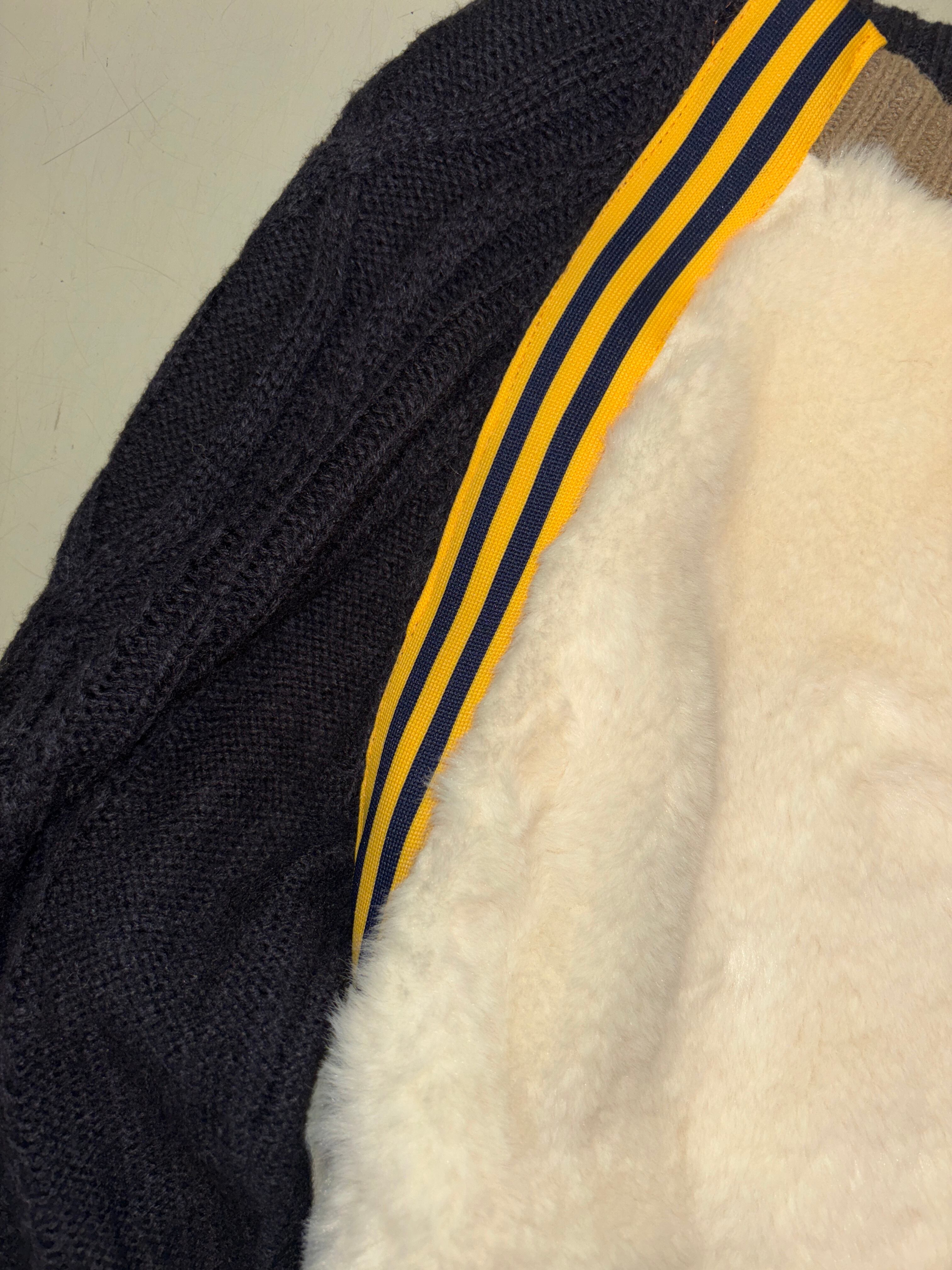 ケーブルニットはネイビー、ボディ部分のフェイクラビットファーはオフホワイト。繋ぎ部分のイエローのラインテープが特徴。