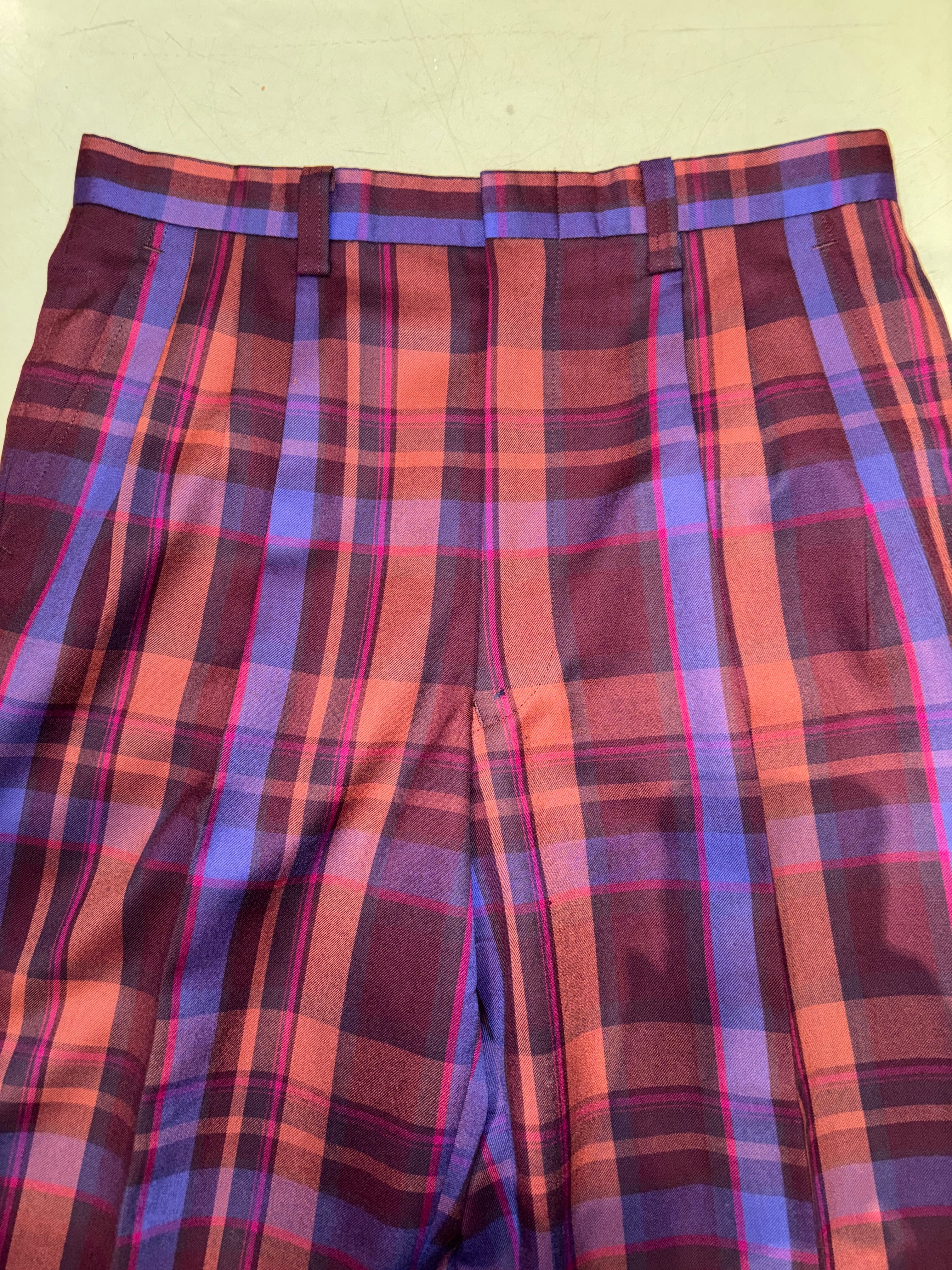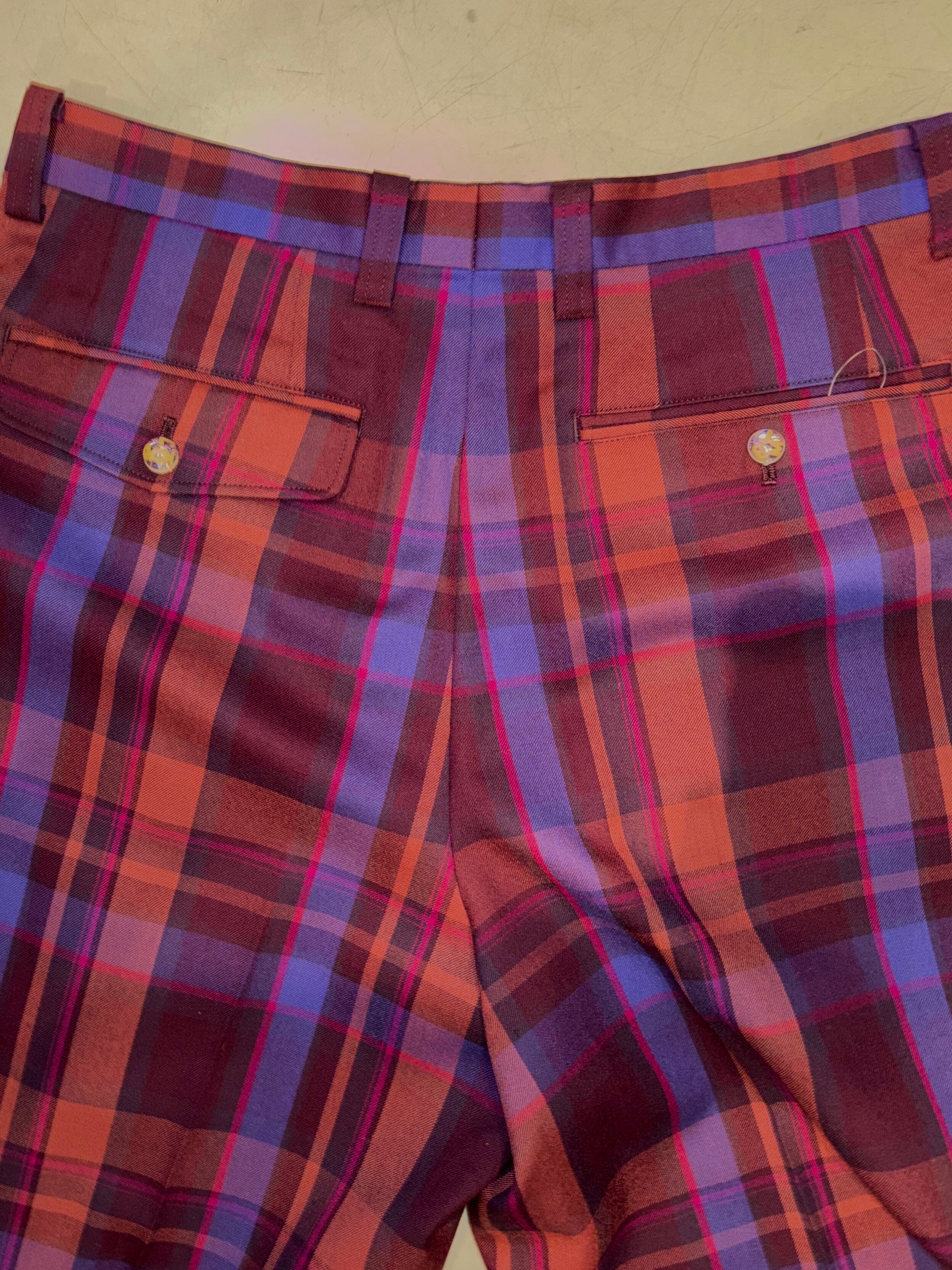 大柄チェックの古着のスラックスにボタンをプラスしたリメイクパンツ。