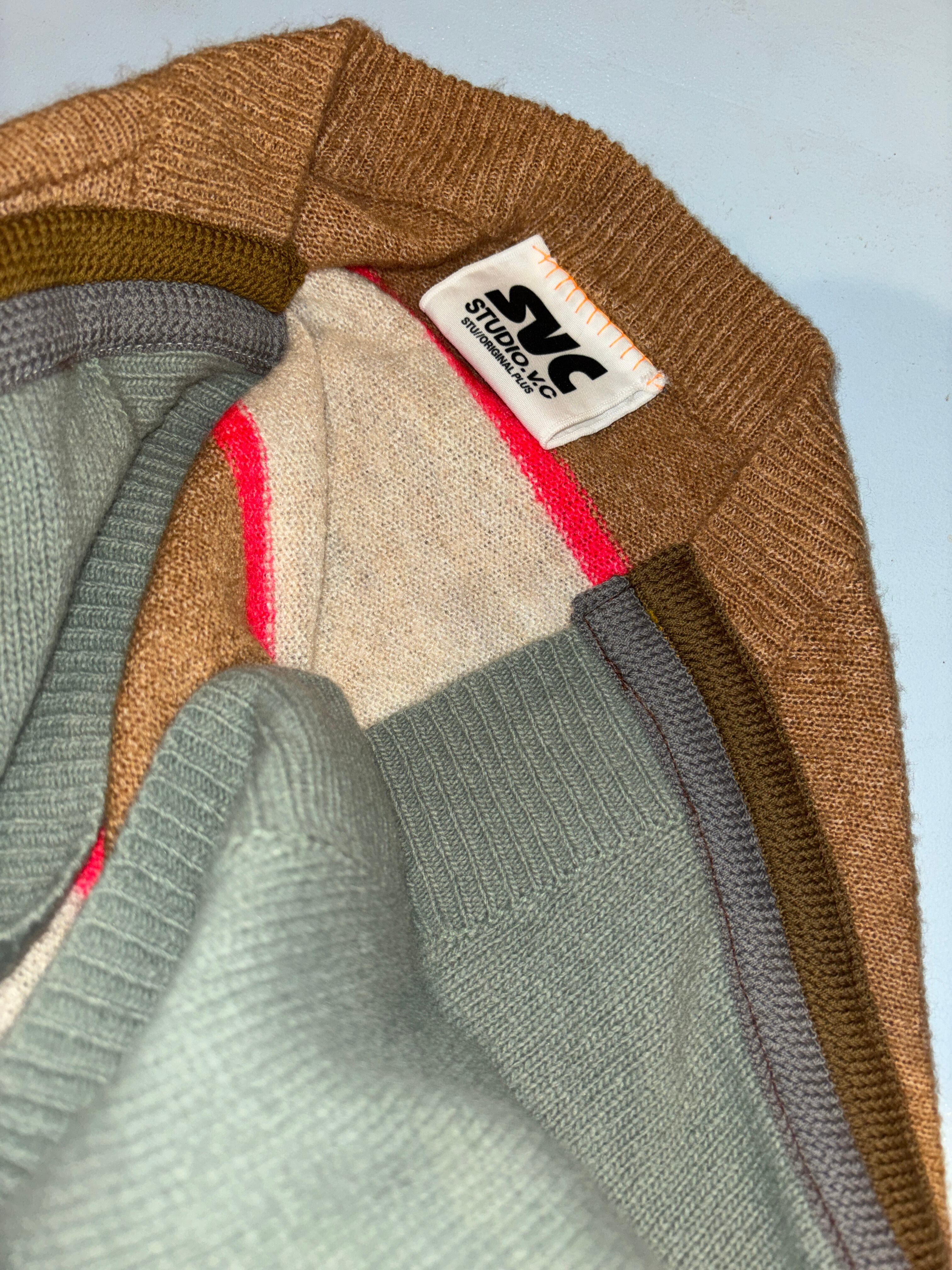 配色の異なる2つのセーターをドッキングし、その繋ぎ目に立体的なボリュームを持たせることで、スキーセーターのような仕上がりになりました。首元は深めのVネック。