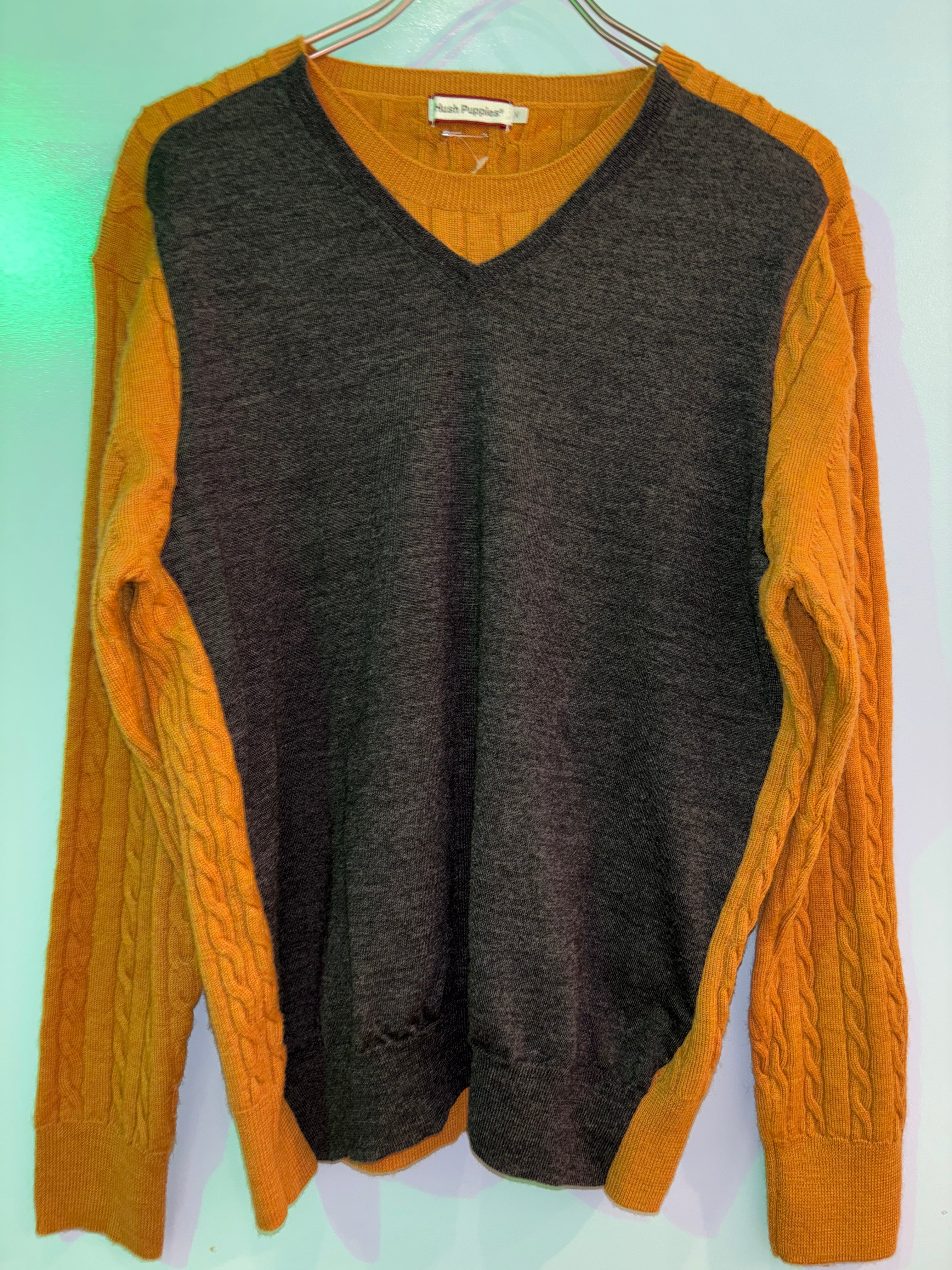 ベースはマスタード色、上に被せたVネックは濃いグレー。左肩に1箇所小さなほつれがありますがリペア済みです。