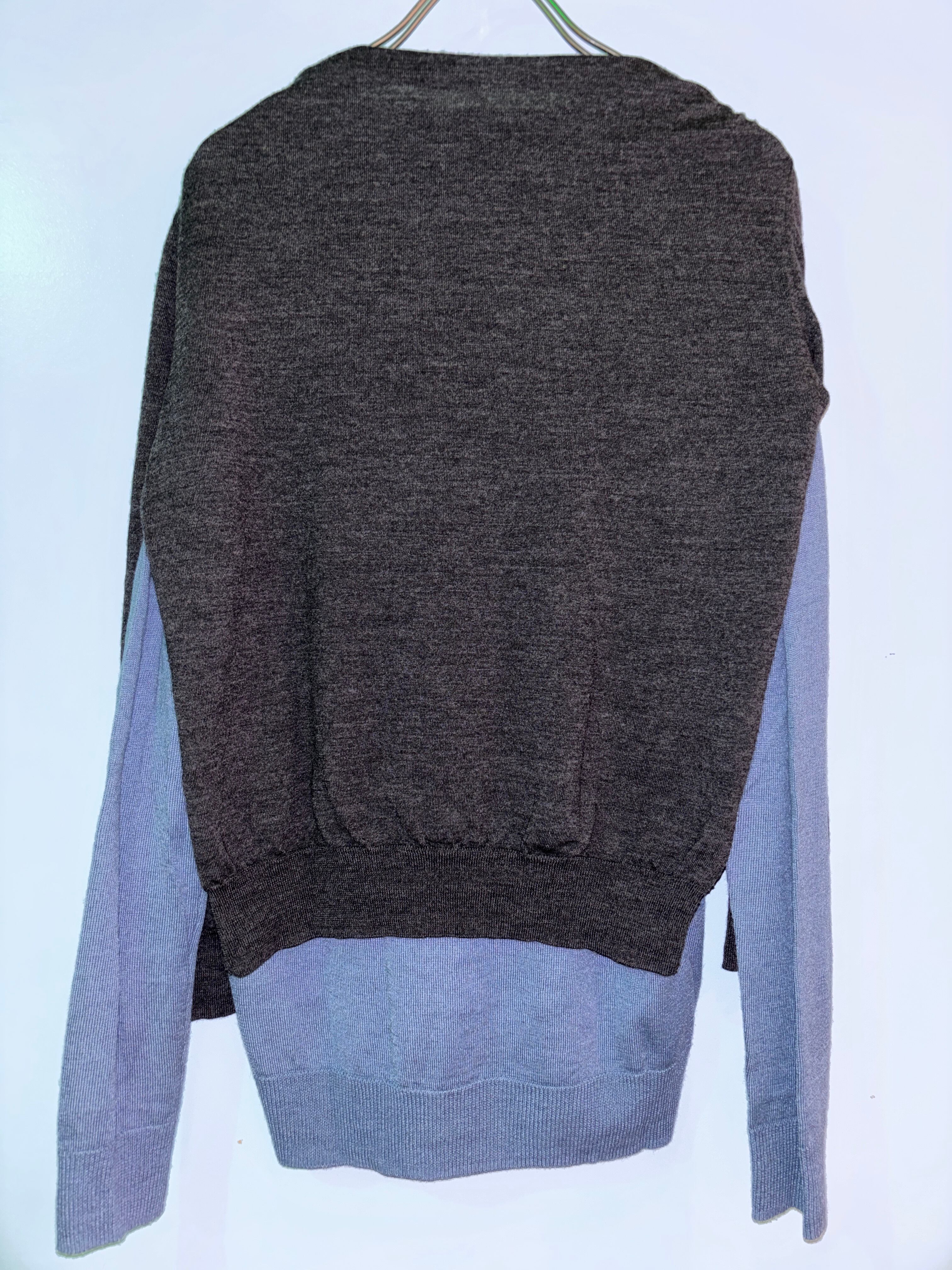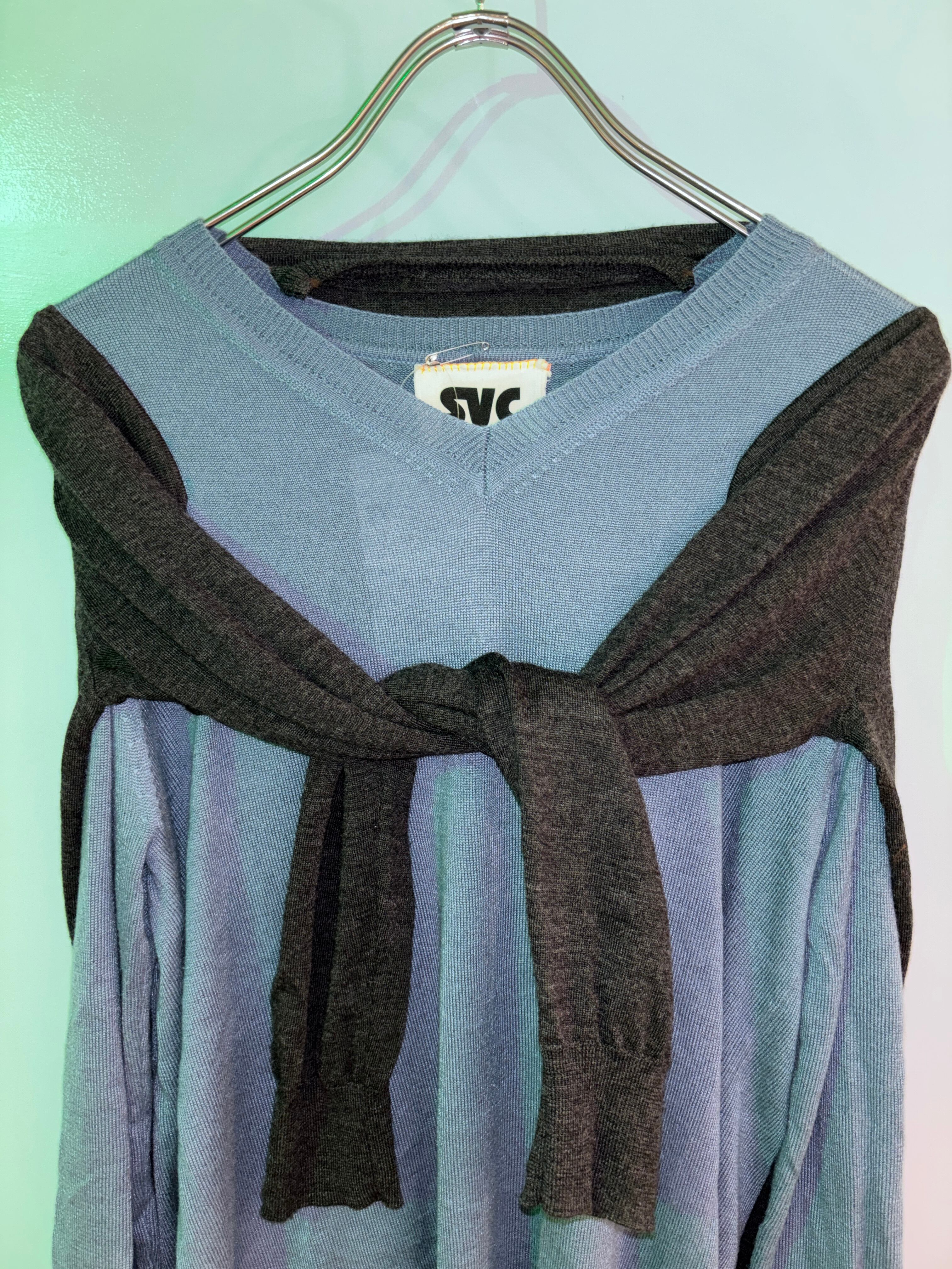 2枚の古着をドッキングさせて、まるで肩からセーターを掛けているようなデザインのリメイク商品。結び目をほどいても肩からずり落ちることはありません。