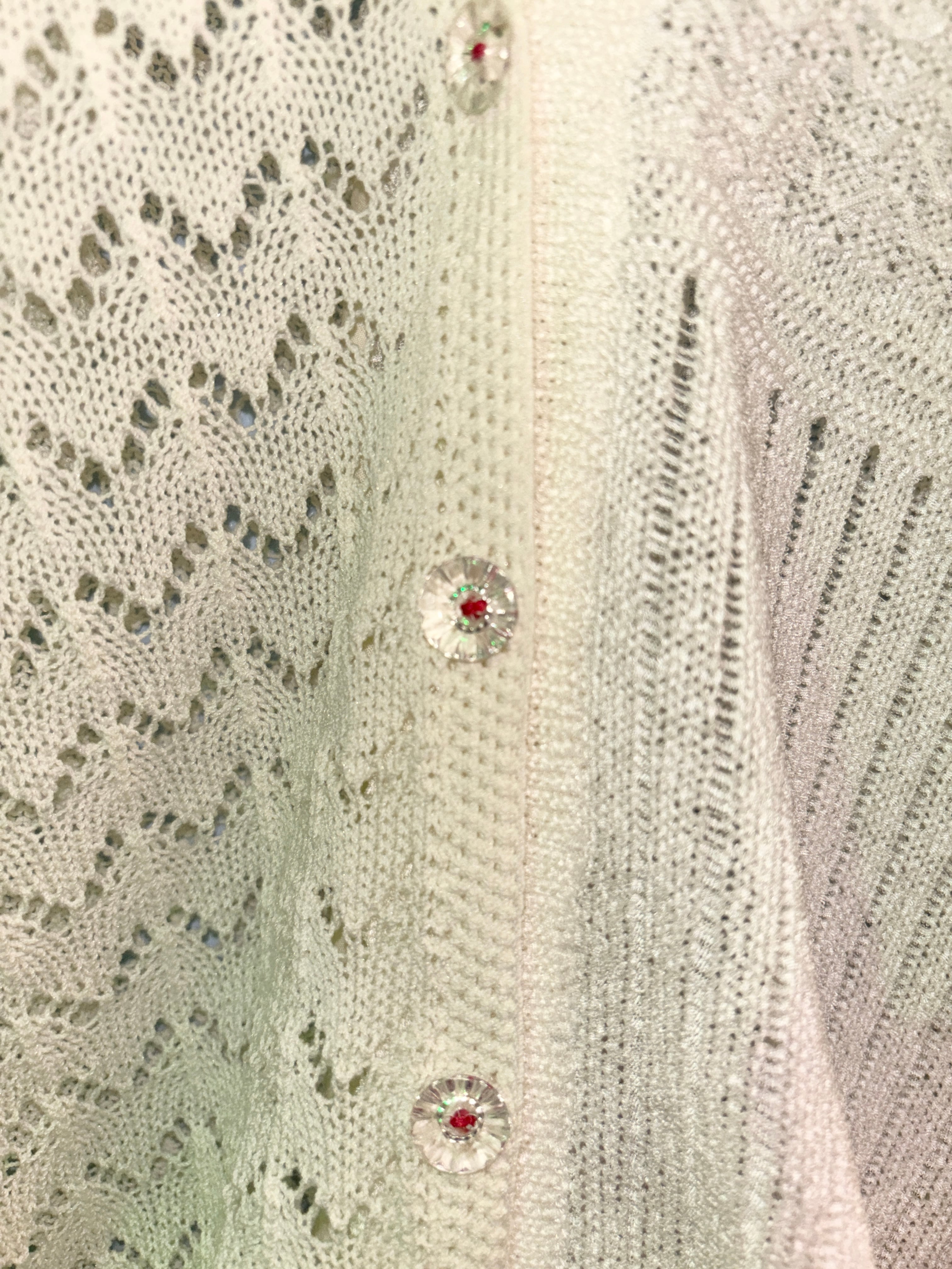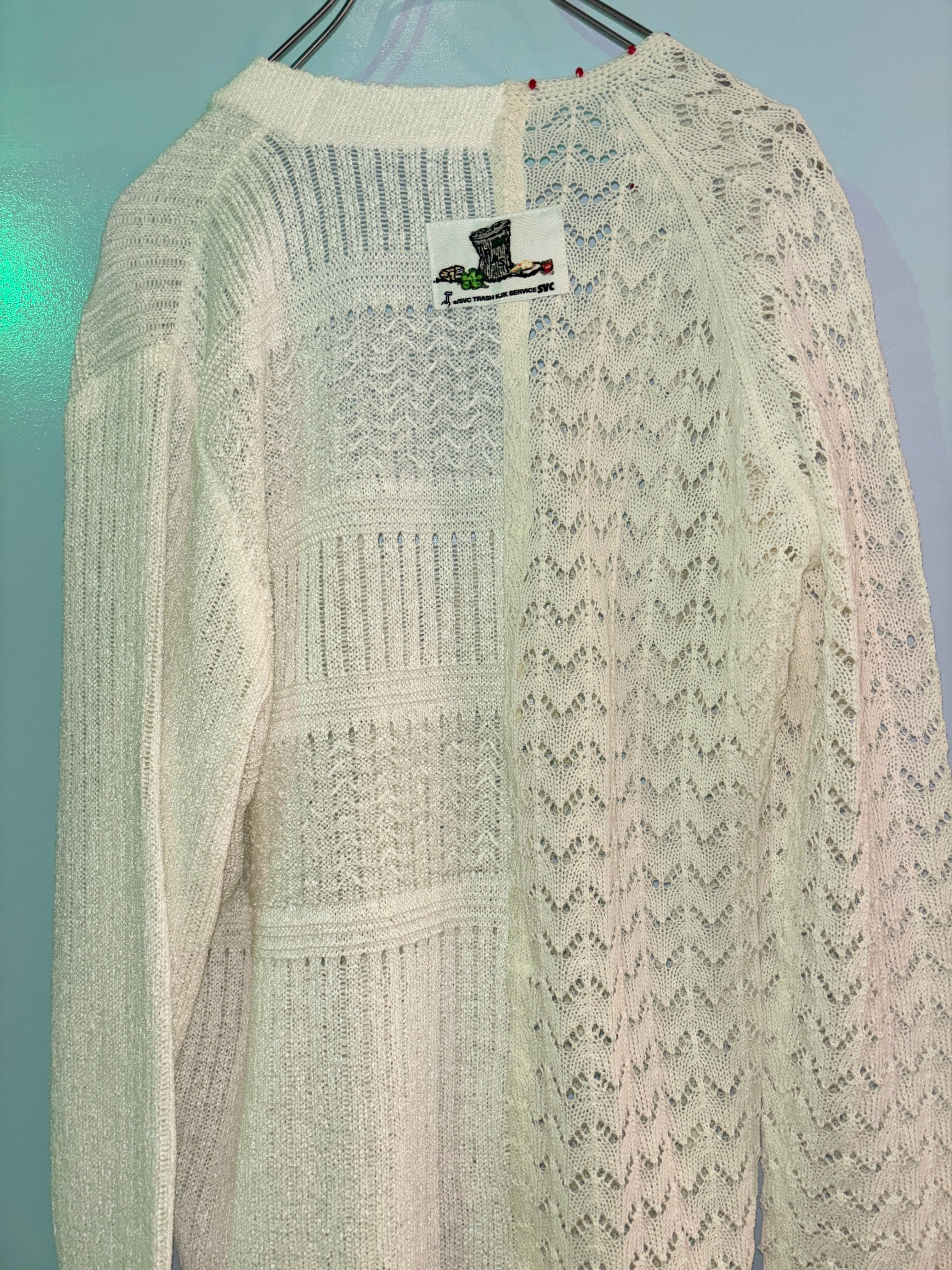 左右で編み地の異なるユーズドニットを接ぎ合わせたアシンメトリーデザインのカーディガン。アクセントに小さな赤いビーズを付けました。透明ボタンの糸も赤。