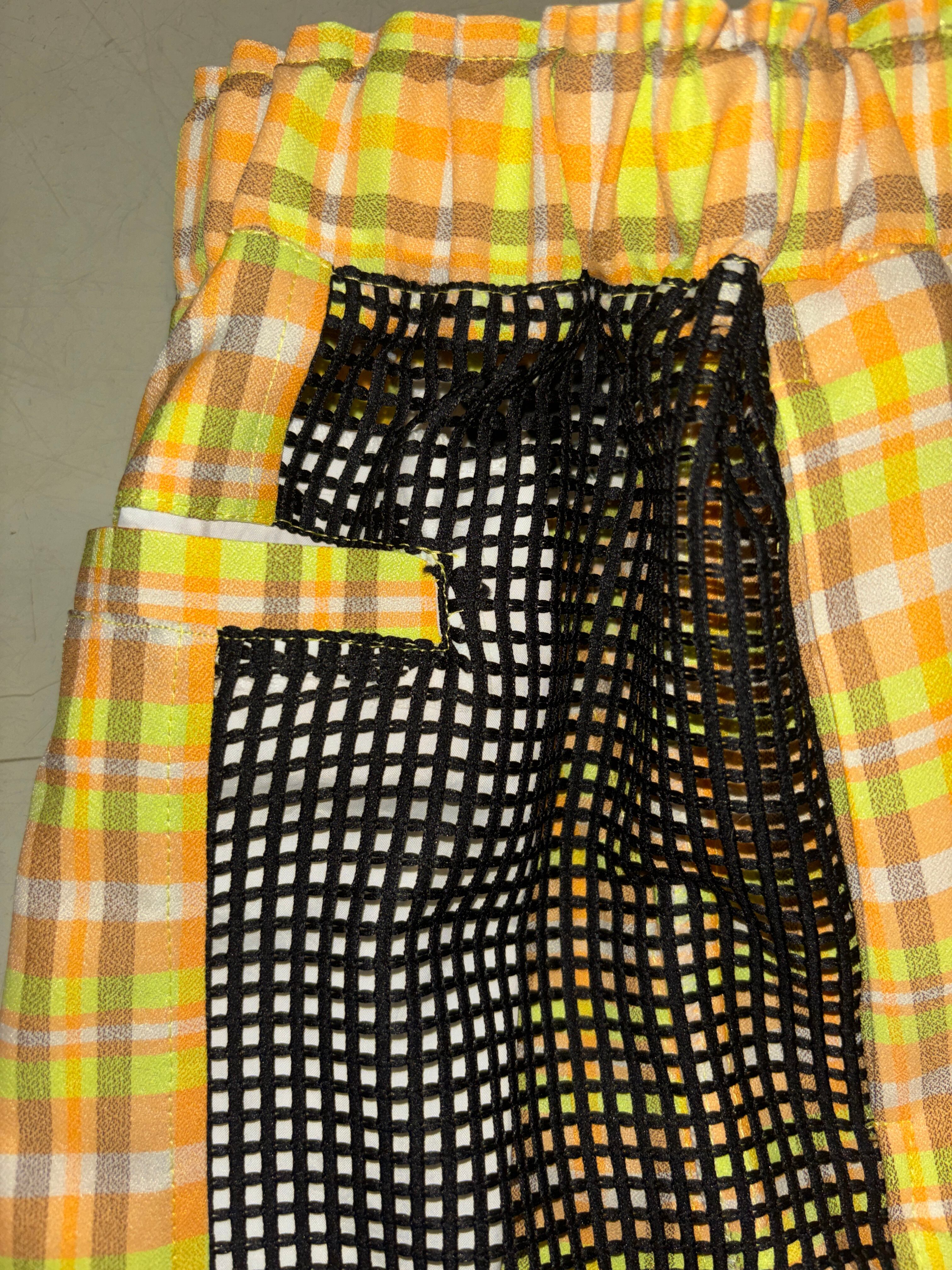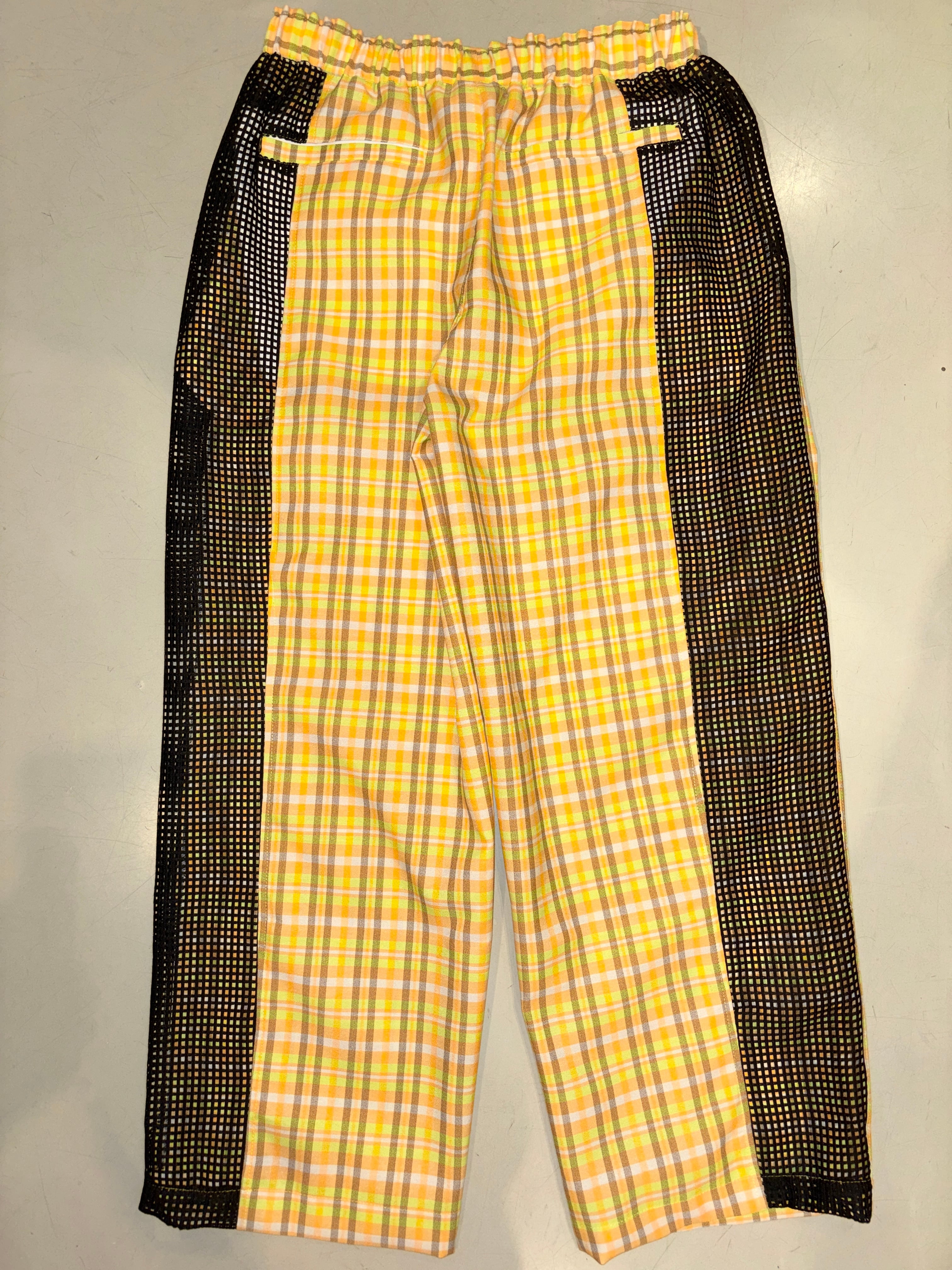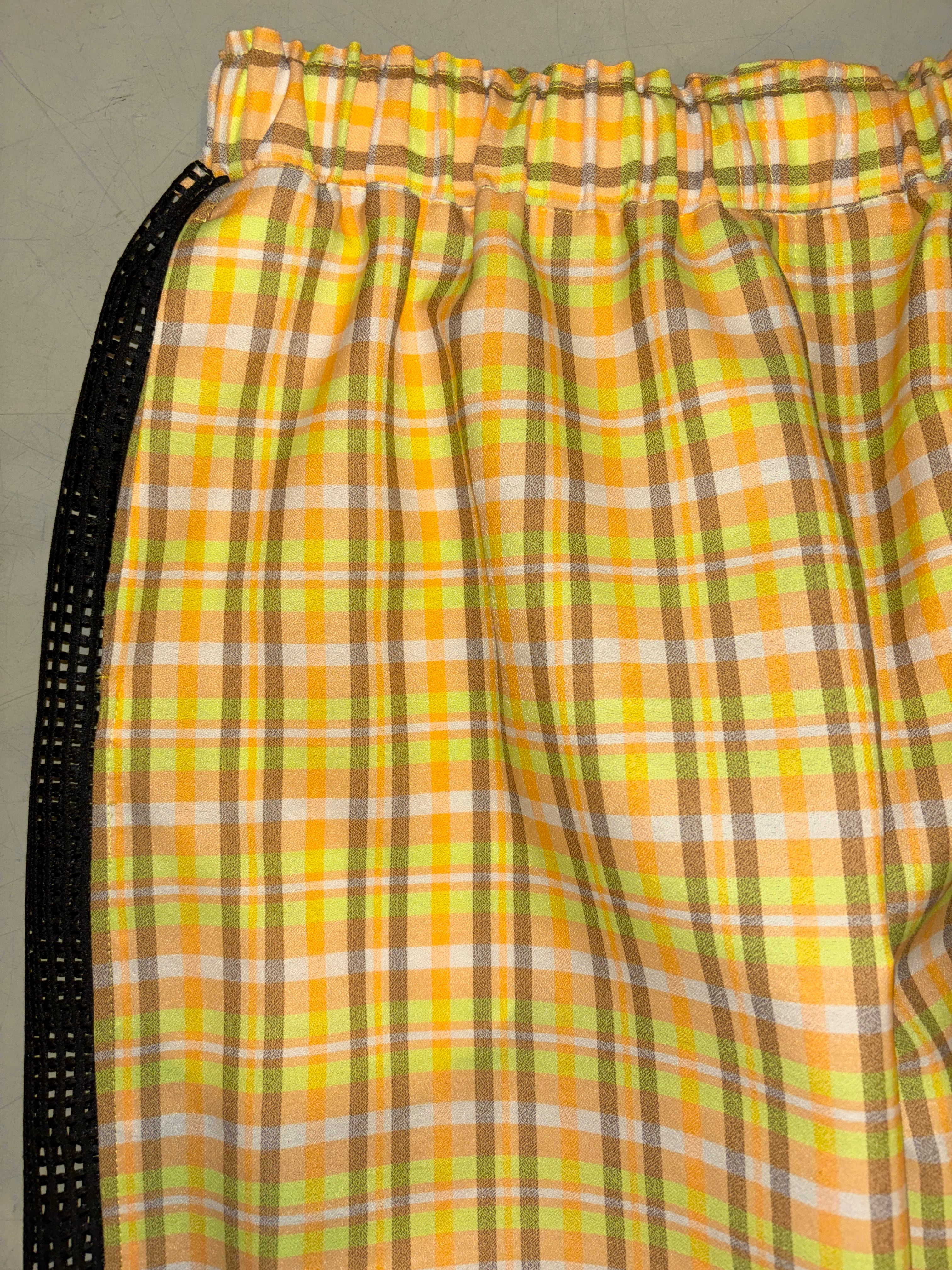 オレンジ×ネオンイエローの明るいチェック柄にブラックメッシュをサイドラインに切り替えたイージーパンツ。通気性も良く見た目も涼しげ。