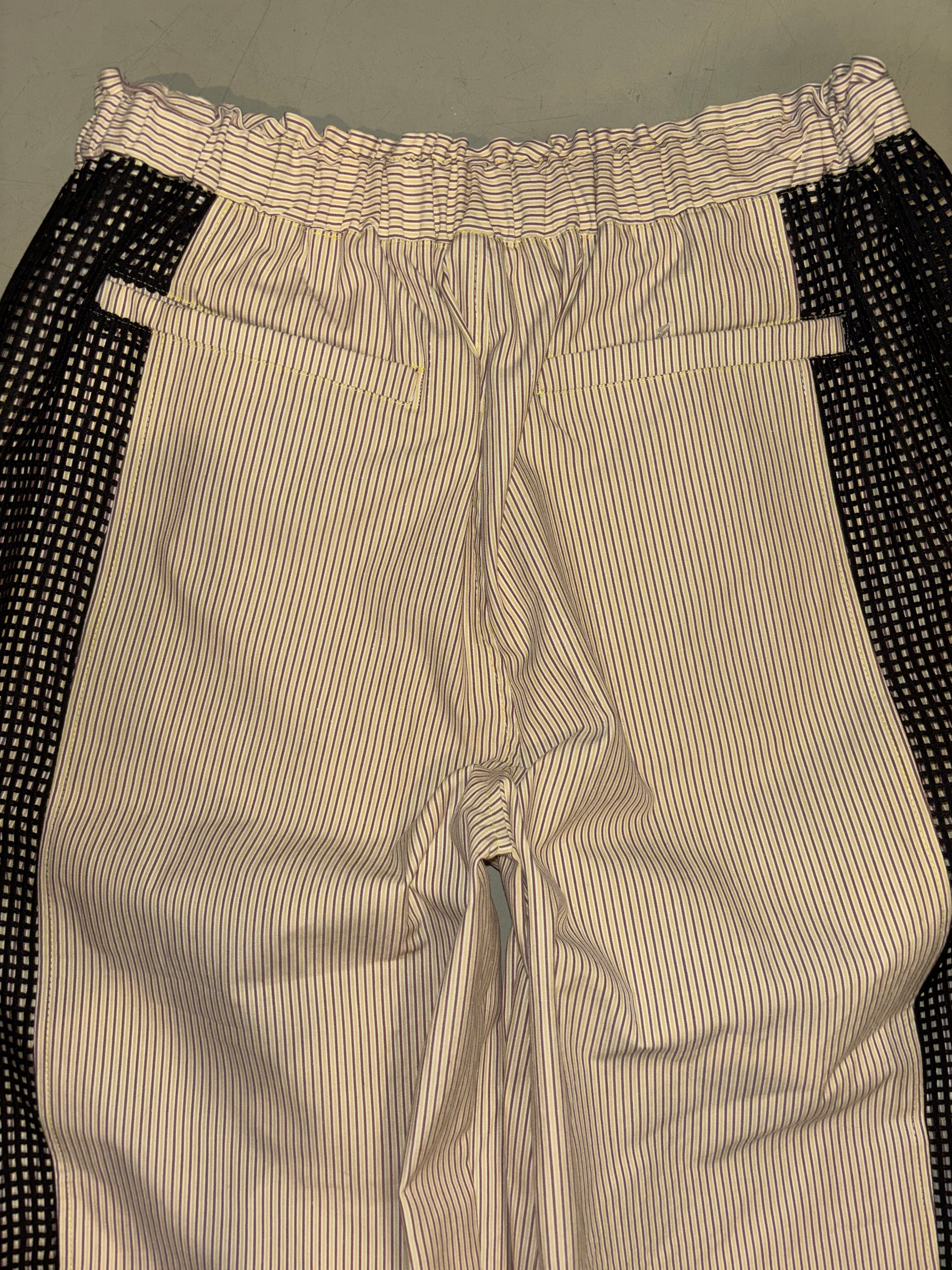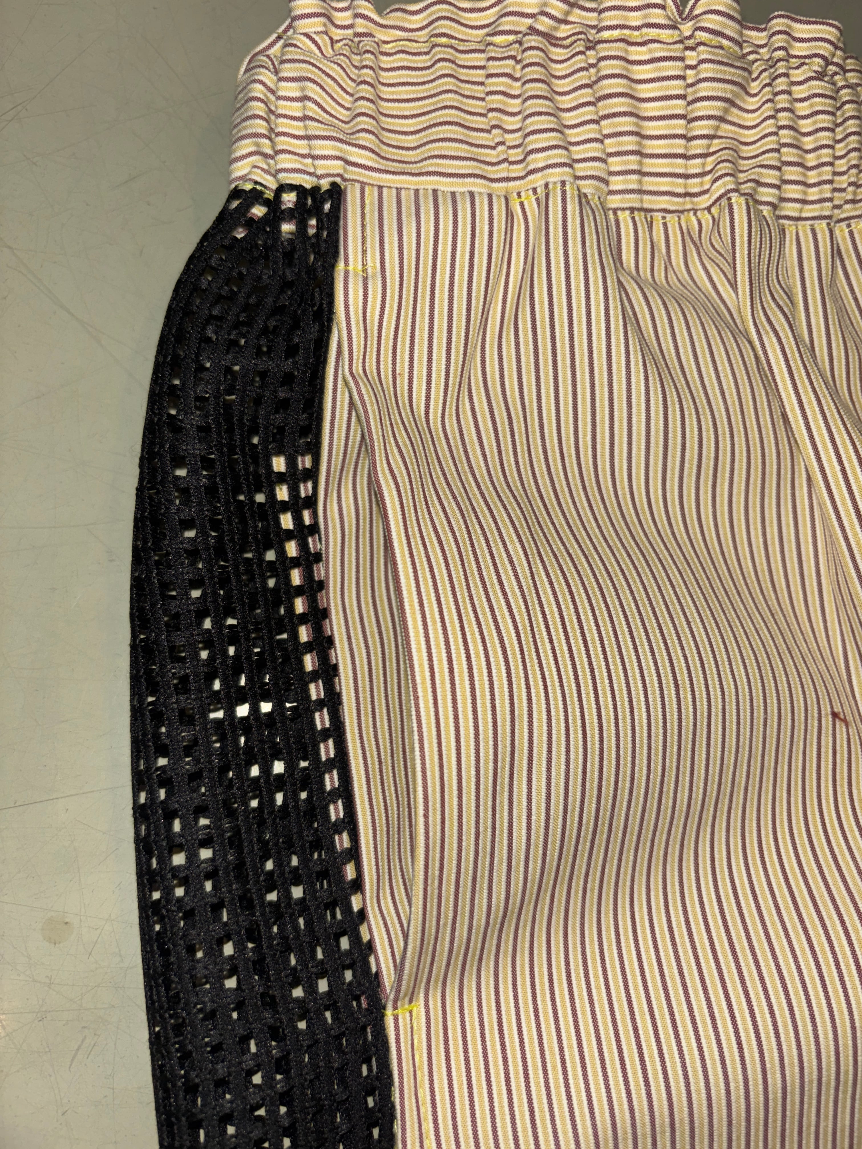 ブラウン×イエローの70sライクなストライプ柄に、ブラックメッシュをサイドラインに切り替えたイージーパンツ。通気性も良く見た目も涼しげ。