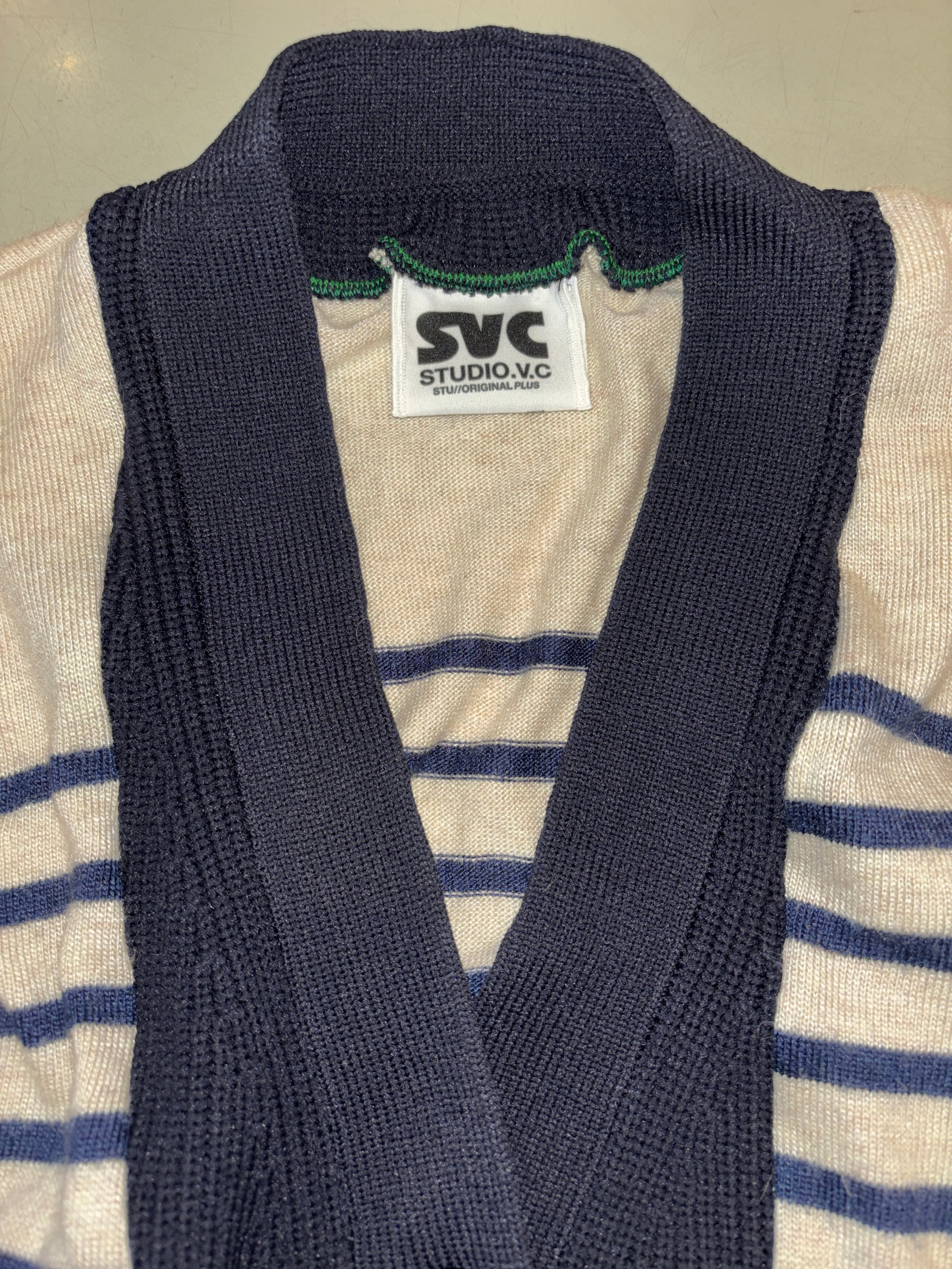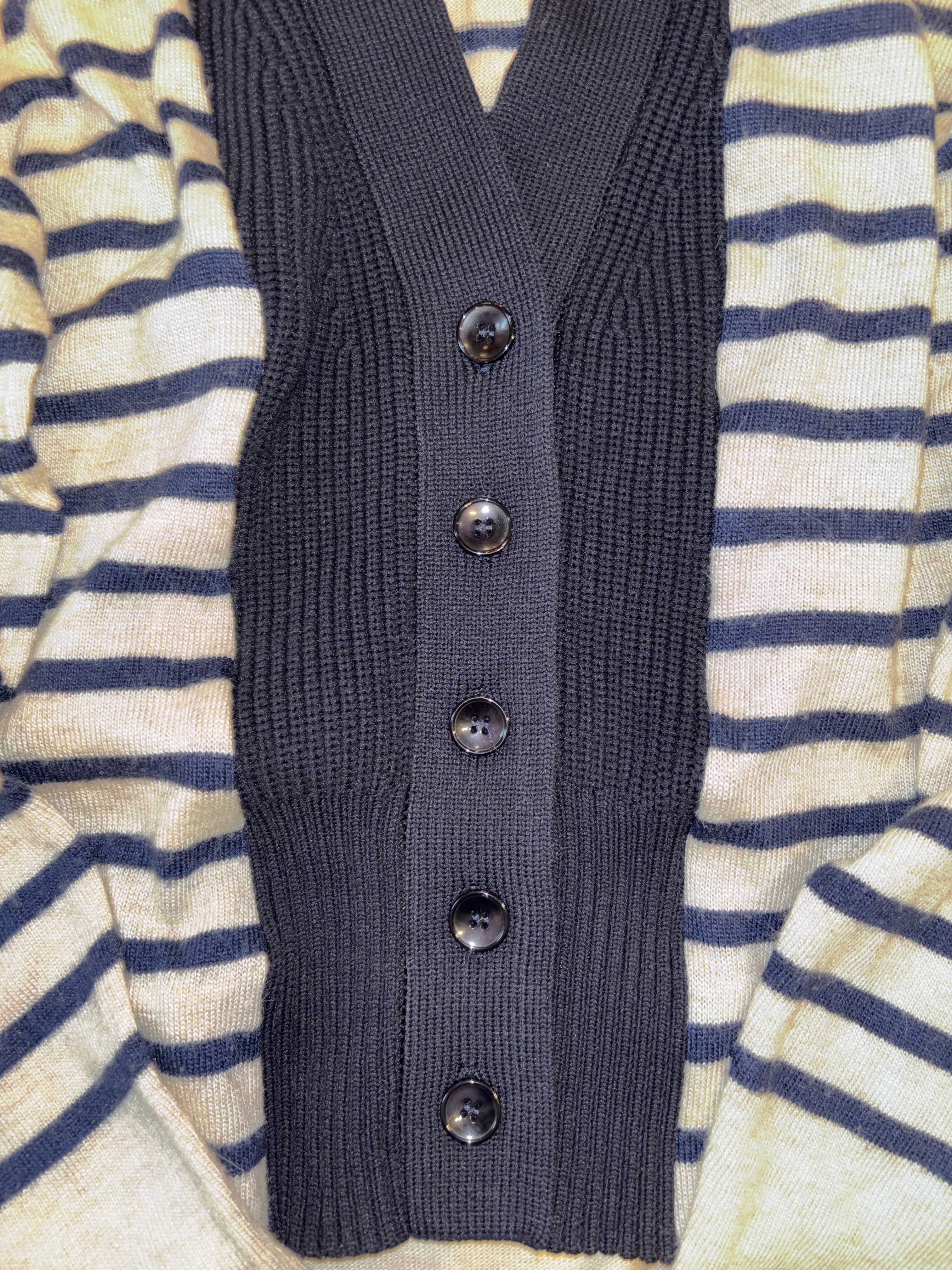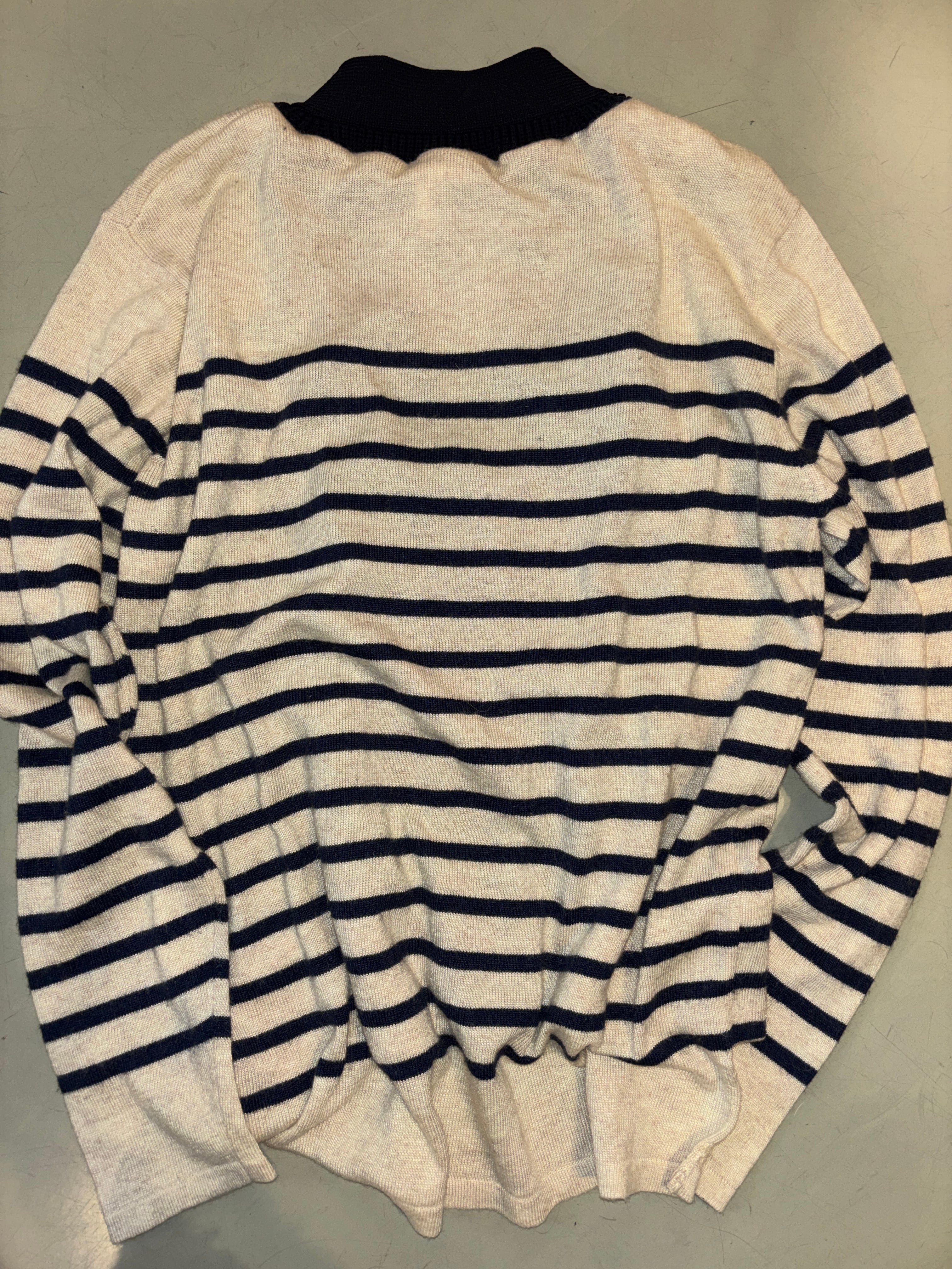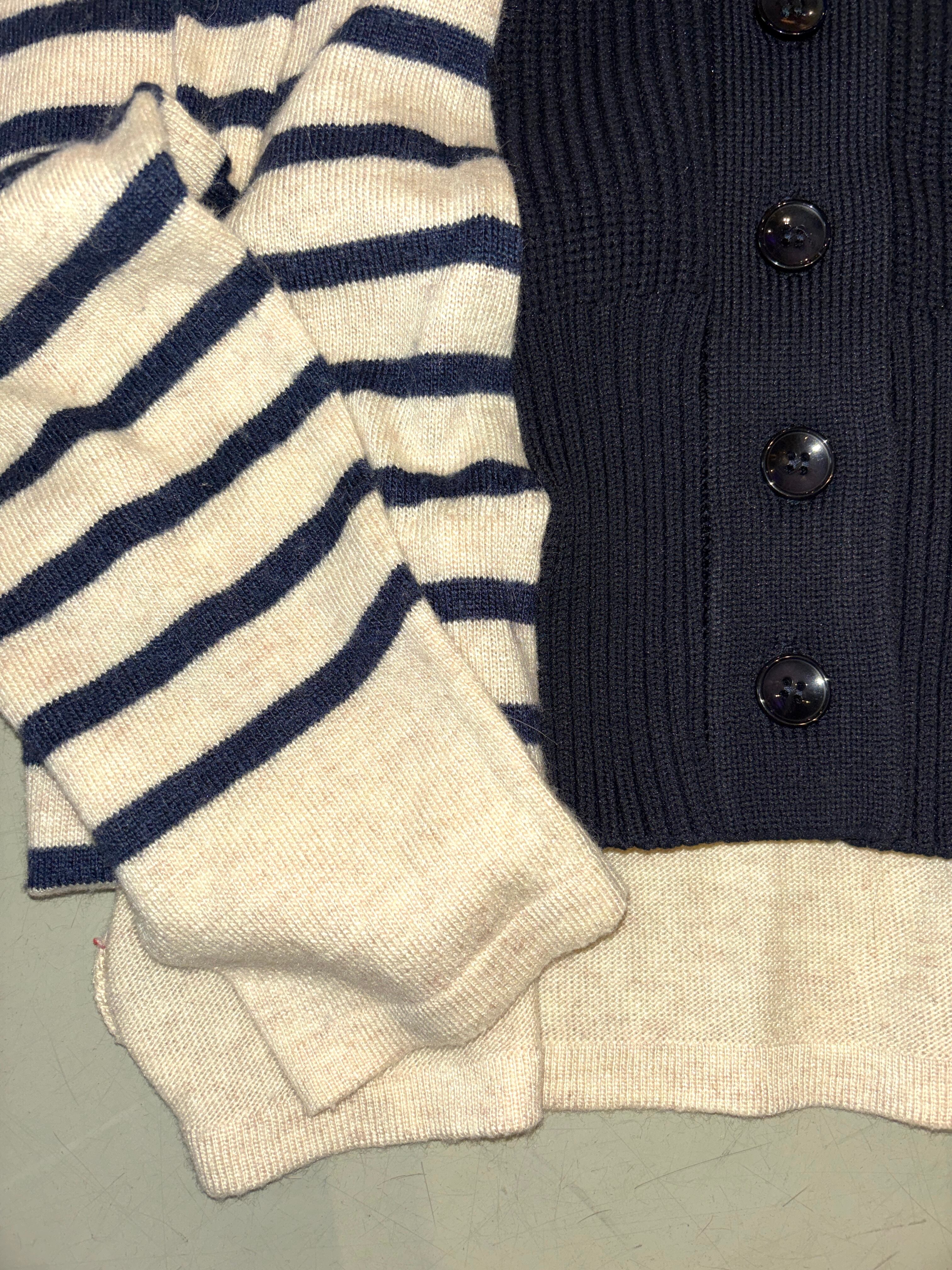 薄手のボーダー柄のセーターに、リブニットの前開きパーツをドッキングさせたリメイクカーディガンです。ベースとなるボーダー部分はレーヨンとアンゴラをブレンドした柔らかくて上質なニット。後ろ見頃の裾に穴がありましたが同色の糸でリペアしています。後ろの方が丈が少し長め。