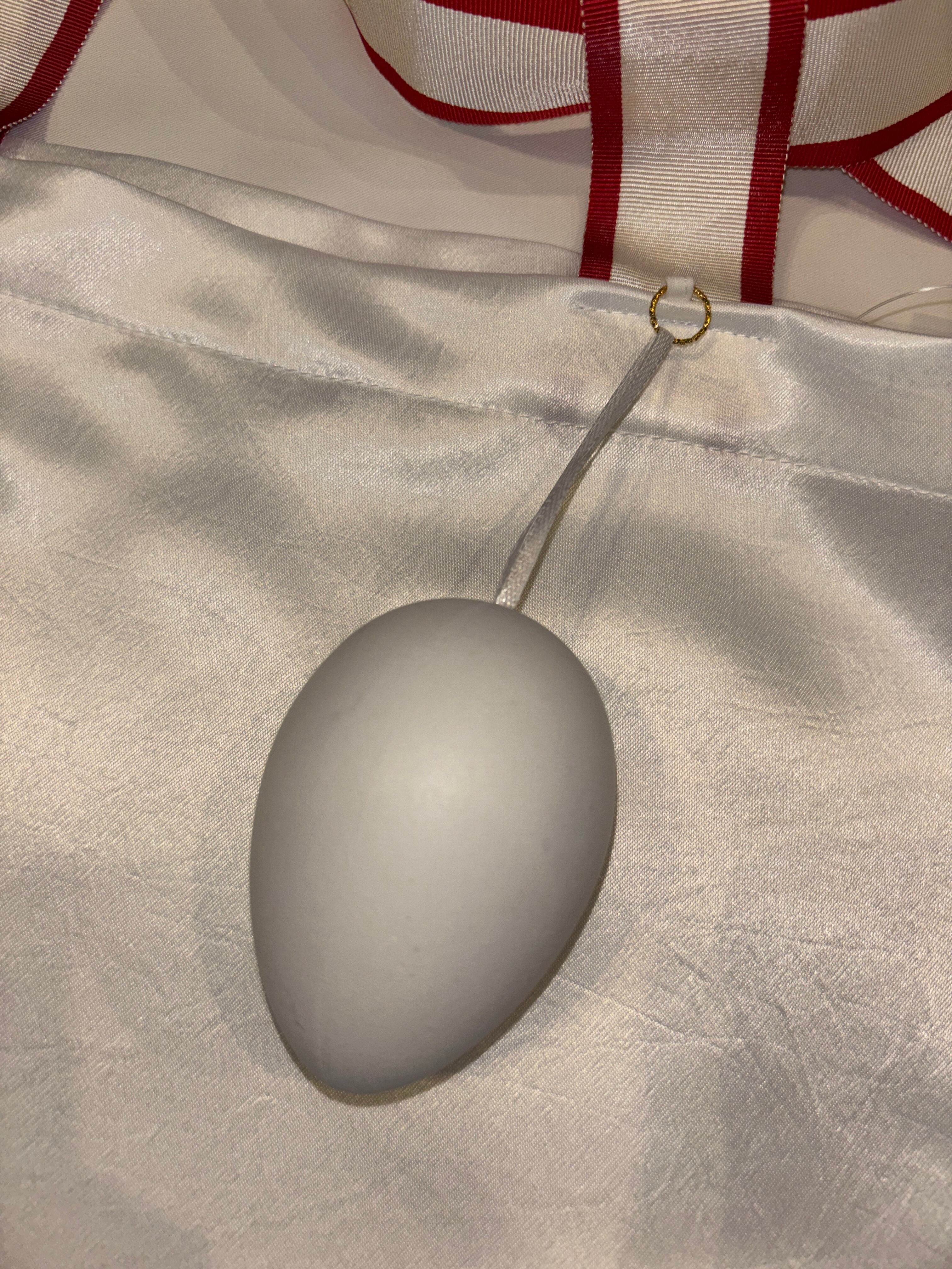 白のサテンにアクセントを添えるのは、幸運の象徴である真っ白の「卵」。