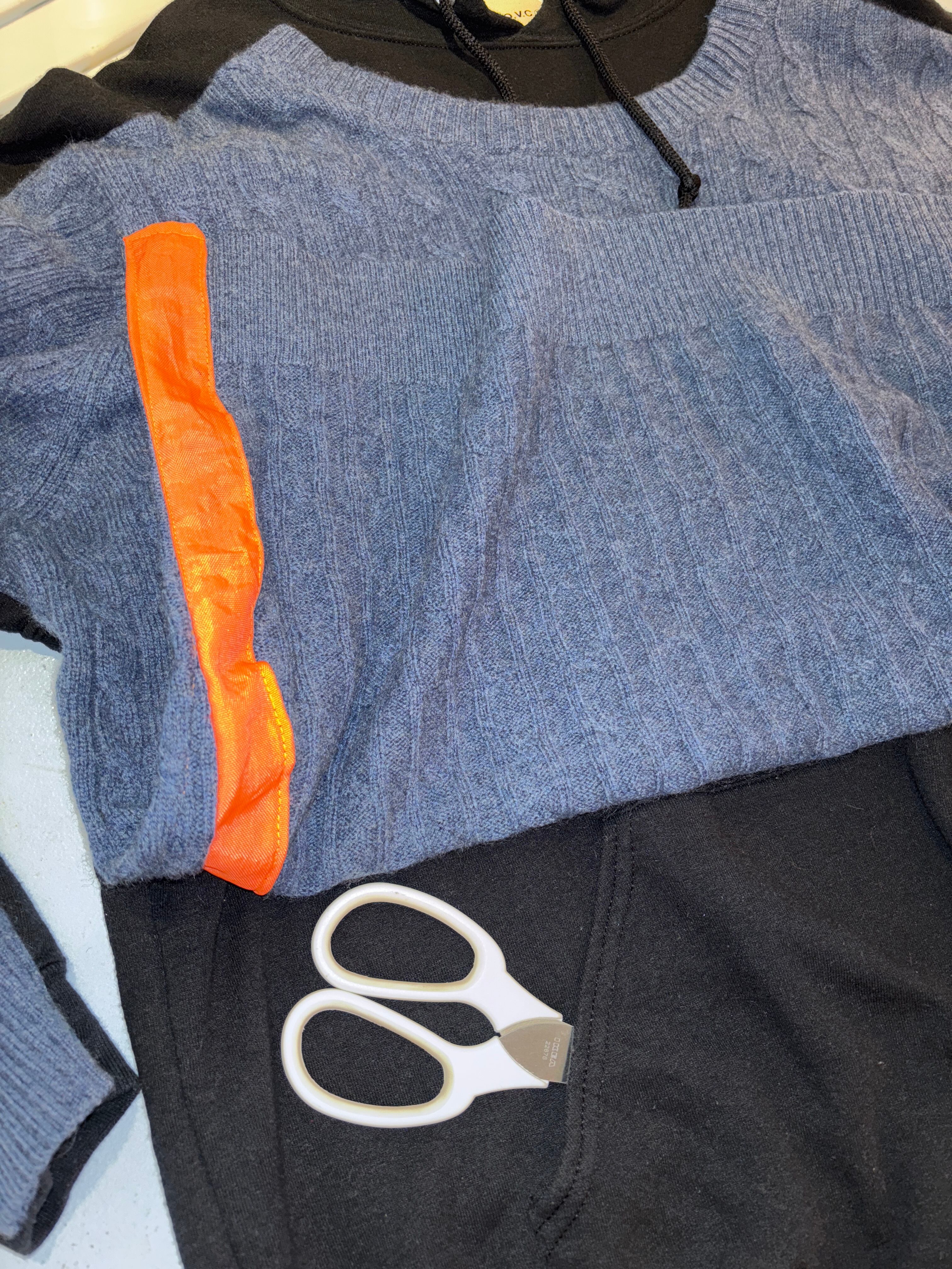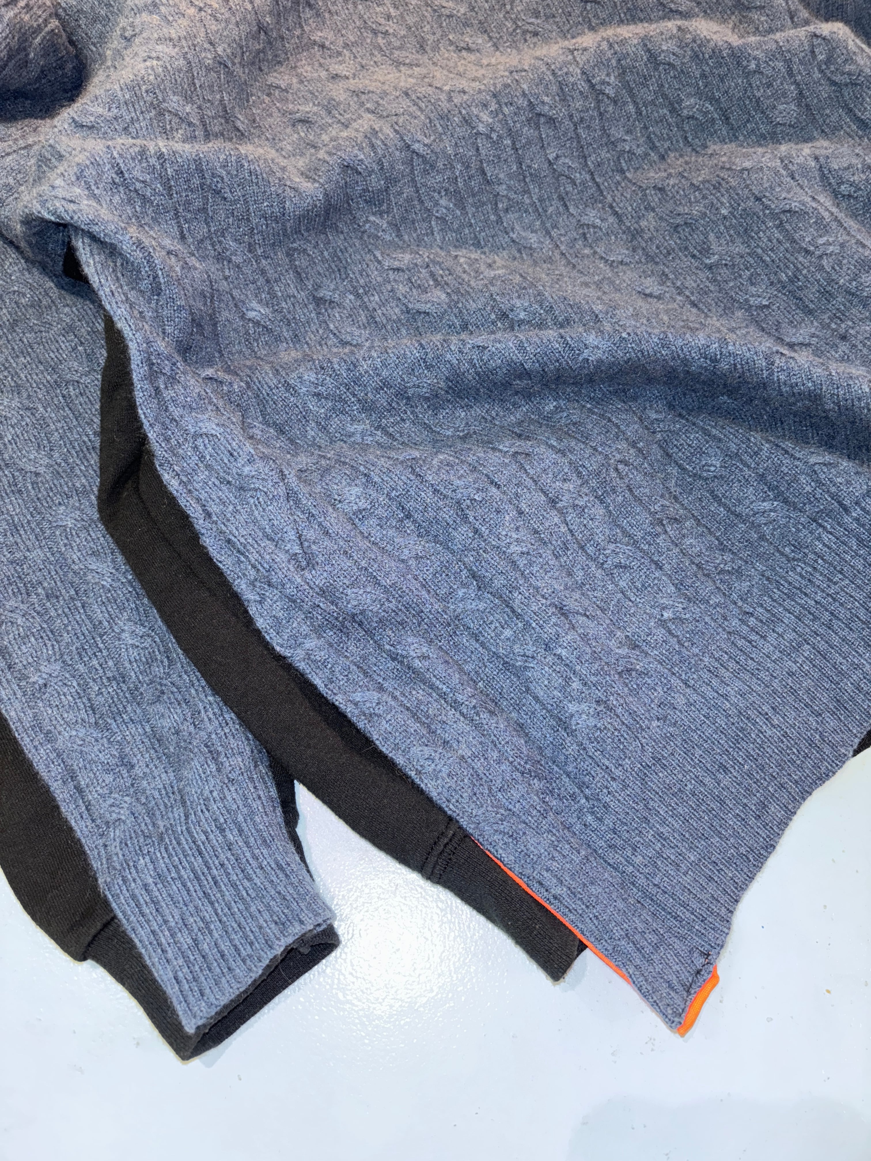黒のフーディーにブルーグレーのケーブルニットをミックス。シンプルでハイブリッドなヴィンテージ古着のリメイクウェアです。